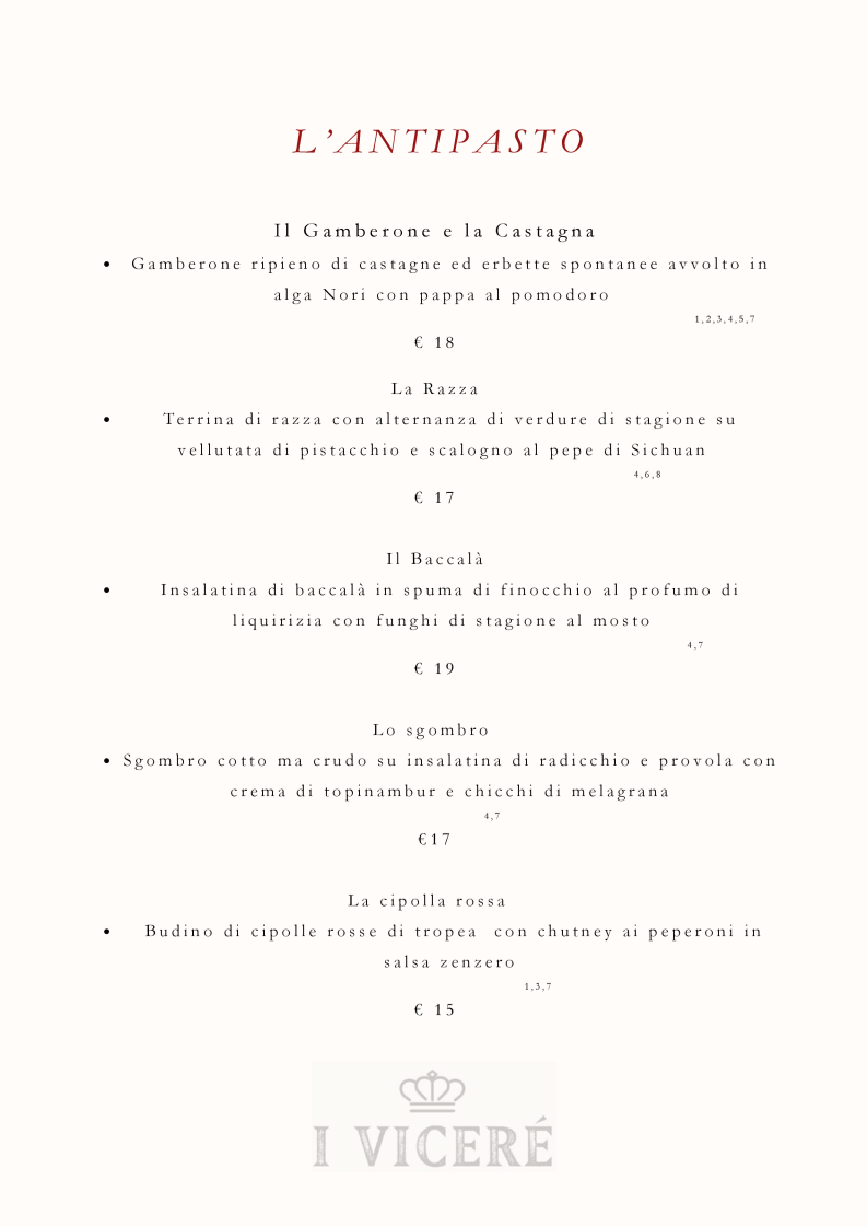 The menu at I VICERÈ Ristorantino-Caffetteria offers a variety of seafood dishes alongside carefully prepared traditional and contemporary Italian cuisine. Visitors can expect a selection that includes fresh fish preparations such as grilled seafood platters and cruditè, as well as pasta dishes featuring seafood and seasonal ingredients.